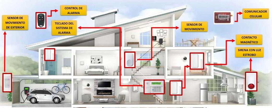 Un sistema de alarma está compuesto principalmente por un panel de control, sensores de movimiento, contactos magnéticos, sensores de ruptura de cristal, sensores de vibración, botones de pánico, sirenas, luz estrobo, batería de respaldo y en algunos casos un sistema de comunicación vía celular.